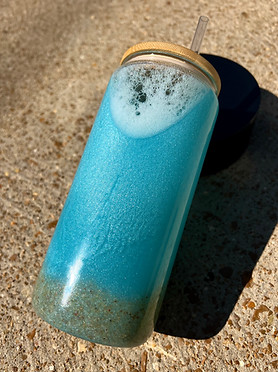 NEW! Ocean Vibes: This can go in most cups! It's a blue mixed mica, we can go lighter, darker, more teal, etc. along with sand at the bottom to create the perfect beach vibe. The mica sparkles in the sunlight and with the added foam at the top it's overall mesmerizing!
